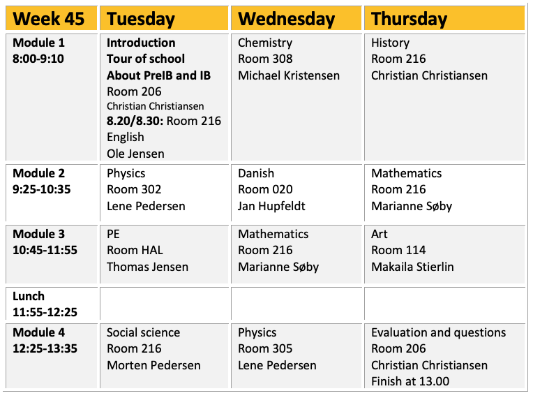 You will have classes with the other students in ‘brobygning’ and visit the PreIB classes in a few lessons.